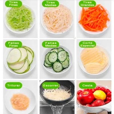 Com 7 tipos diferentes de lâminas e um escorredor, a facilidade em descascar e fatiar qualquer legume e verdura não é mais um problema. Um utensílio que não pode faltar na sua cozinha e se destaca entre os cortadores comuns.